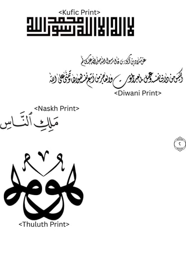 Kufic: One of the oldest scripts, known for its angular, blocky letters. It was historically used for early copies of the Quran and is often seen in architectural decoration.